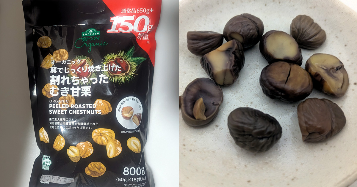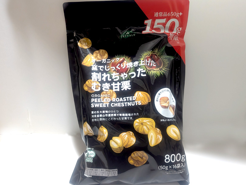 オーガニック 釜でじっくり焼き上げた割れちゃったむき甘栗は、まいばすけっとやイオンで購入できるトップバリュというプライベートブランド商品です。