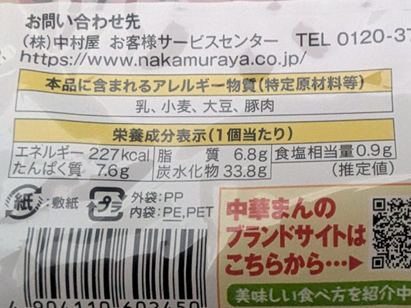| 1個あたりの栄養成分 | たんぱく質7.6g、脂質6.8g、 炭水化物33.8g、食塩相当量0.9g  |