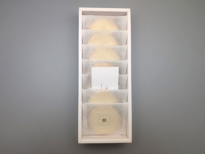 白い箱の表面は和紙のようなエンボス加工をされた手触りで、洋風のお菓子なのだが和の趣を残している。
