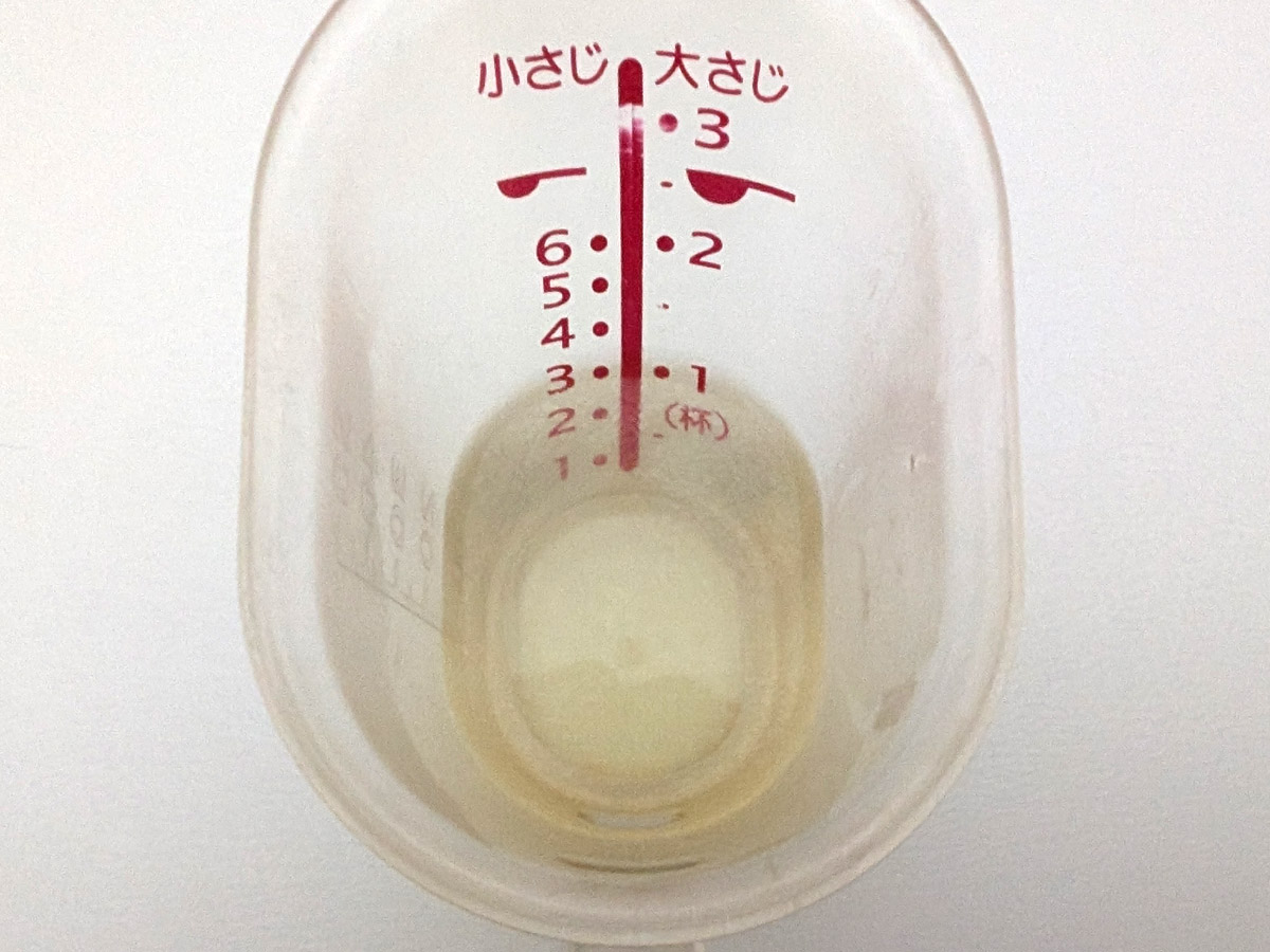 本来、大さじ1の分だけ容器に残せばいいのだが、湯切りしながらだと難しい。そこで一度別の器にお湯を流し、そこから大さじ1分のお湯を取るのがオススメ。