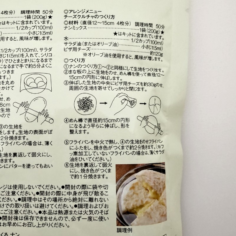 調理時間は50分。はじめての場合はもう少し時間がかかるかもしれない、と思っておこう。一袋で4枚分作れるので、ナンを2枚、アレンジメニュー「チーズクルチャ」を2枚作ることにする。