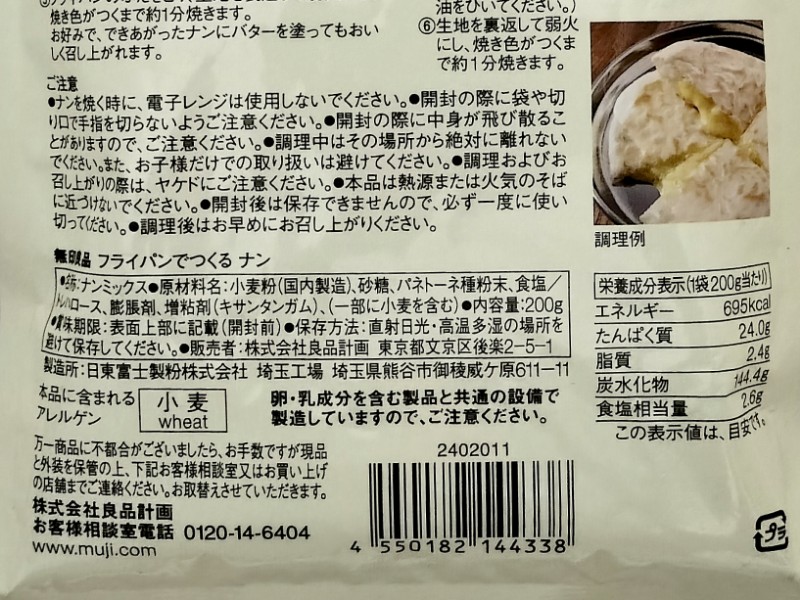原材料や栄養成分表示。「フライパンでつくるナン」の1袋200g当たりのカロリーは695kcal。