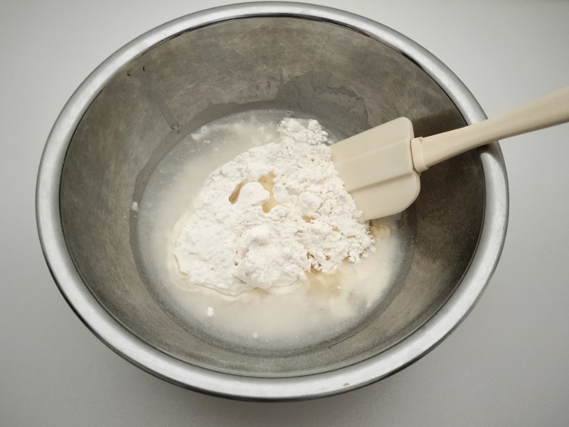 ①ボウルにナンミックス。水1/2カップ(100ml)、サラダ油(またはオリーブオイル)小さじ1(15ml)を入れて、シリコーンスパチュラ(調理ベラ)で、ひとまとまりになるまで混ぜます。