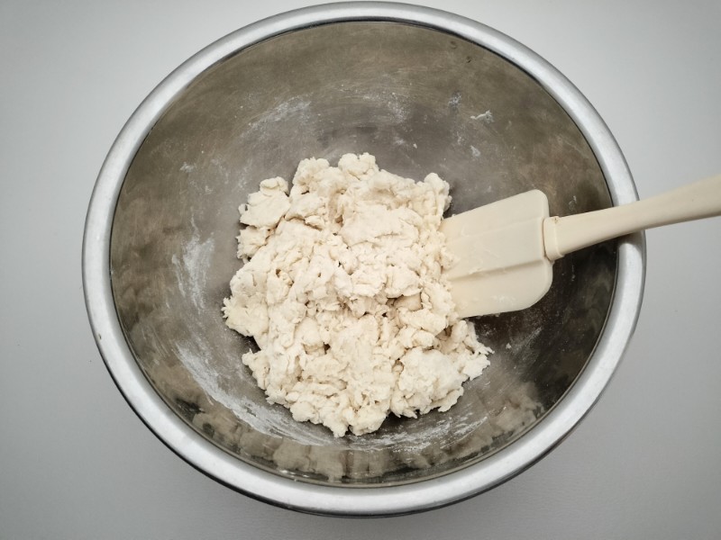 次に、なめらかになるまで手で約5分よくこねます。(最初は手にくっつきますが、徐々にまとまってきます。)