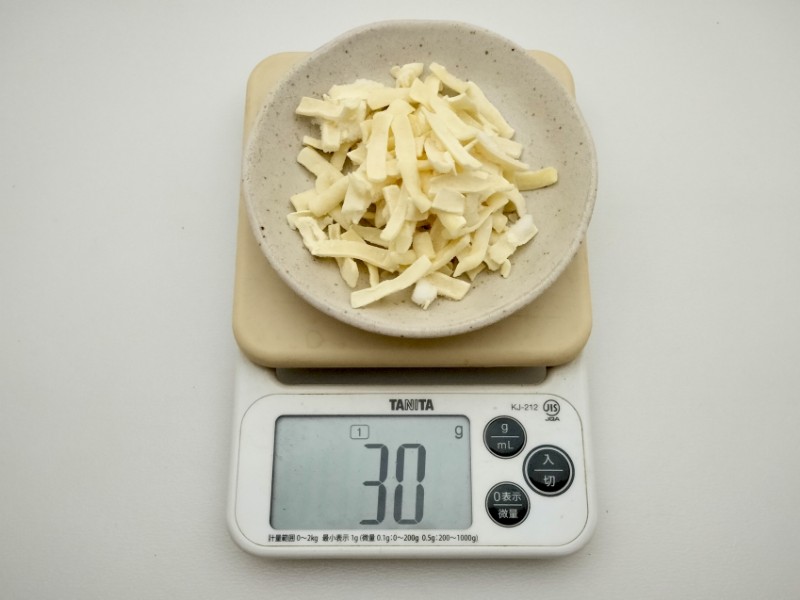 今回は2枚をナンにして、2枚をチーズクルチャにするので、ピザ用チーズを30g×2枚分(計60g)用意した。
