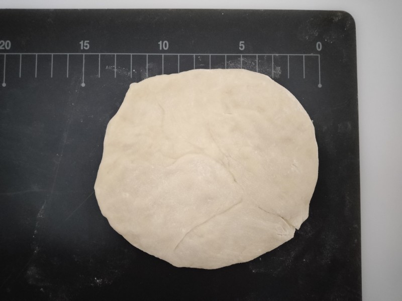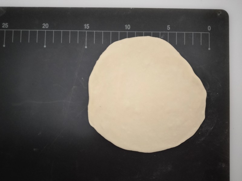 ②まな板の上に生地をのせ、めん棒を使って直径12〜15cmの円形に伸ばします。