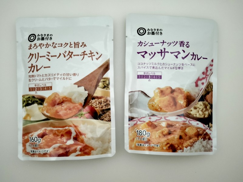 『フライパンでつくるナン』は無印良品の商品で焼いて作ったけれど、カレーは西友の「みなさまのお墨付きシリーズ」の『クリーミーバターチキンカレー』(左・税込204円)と『マッサマンカレー』(右・税込204円)にする。レトルトなので温めるだけ。