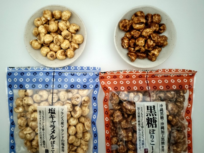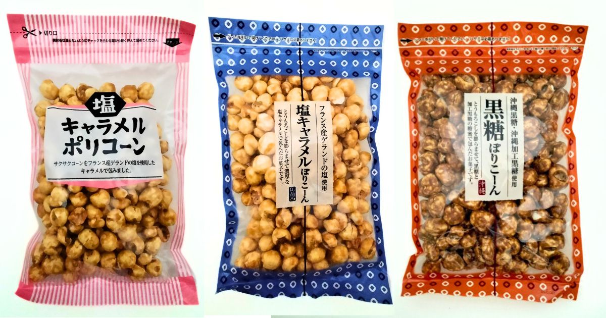 店頭で見かけて思わず購入した『塩キャラメルポリコーン』、『塩キャラメルぽりこーん』&『黒糖ぽりこーん』。ポップコーンではなく、あの「ポリコーン」である。