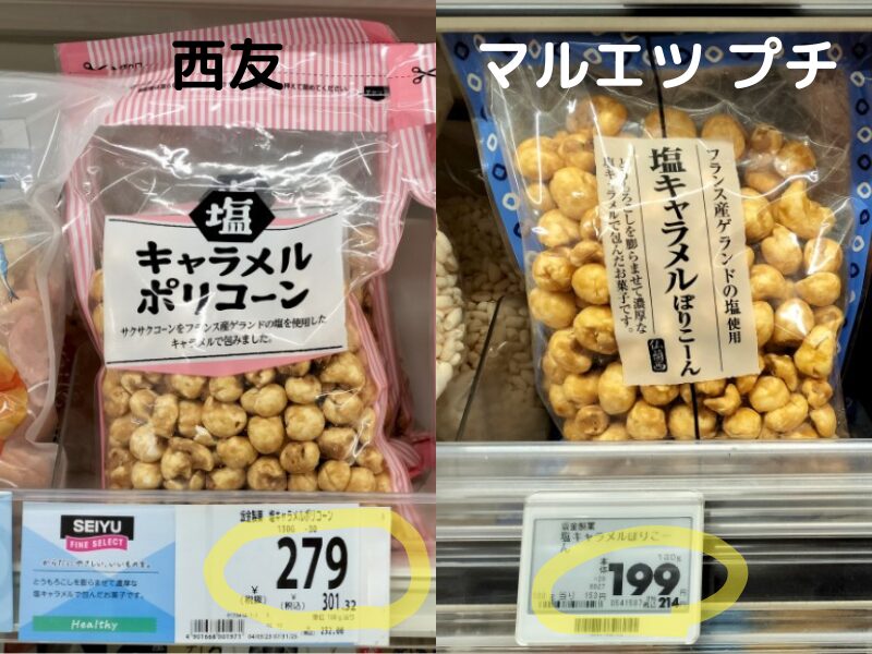 最初に西友で購入した『塩キャラメルポリコーン』食べて、次にマルエツ プチで購入した『塩キャラメルぽりこーん』食べてみると…