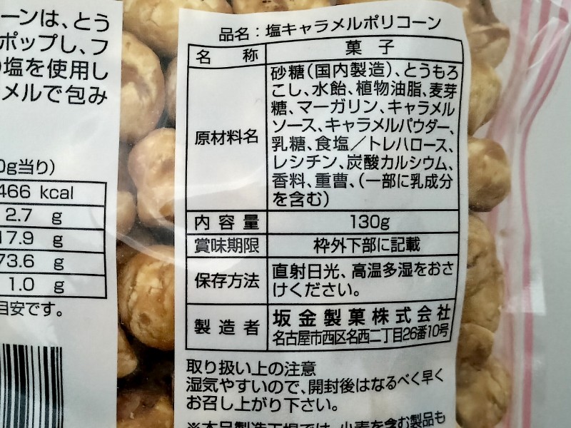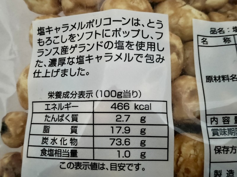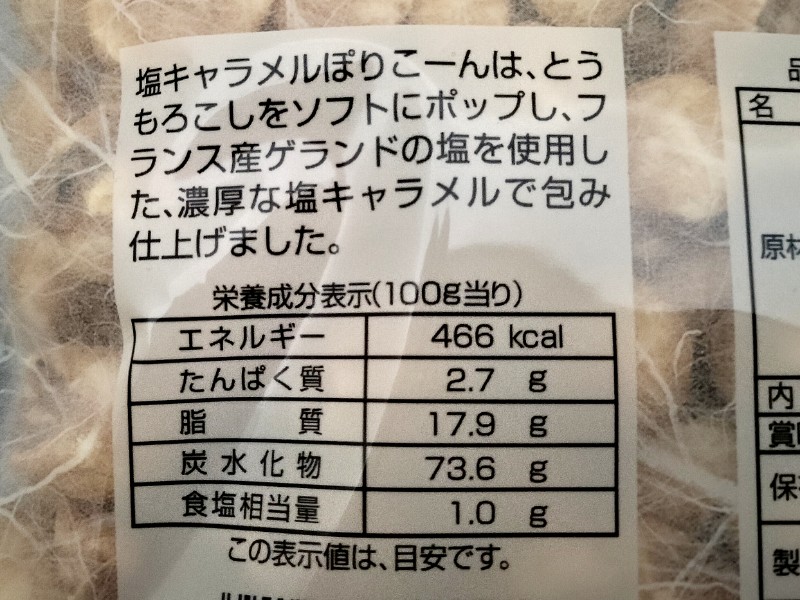 栄養成分表示。100g当りの『塩キャラメルぽりこーん』のカロリーは466kcal。