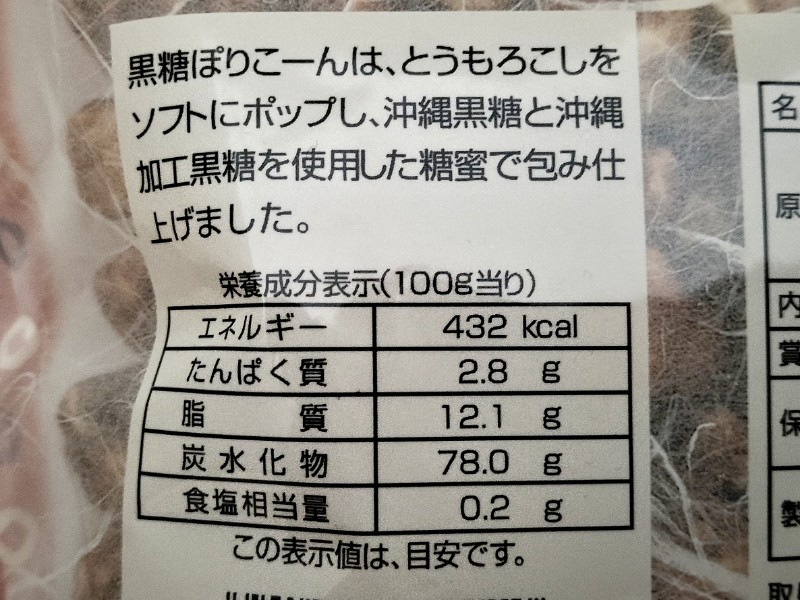 栄養成分表示。100g当りの『黒糖ぽりこーん』のカロリーは432kcal。