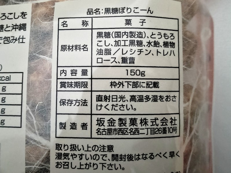 ”沖縄黒糖・沖縄加工黒糖使用”、ひらがなで”ぽりこーん”。