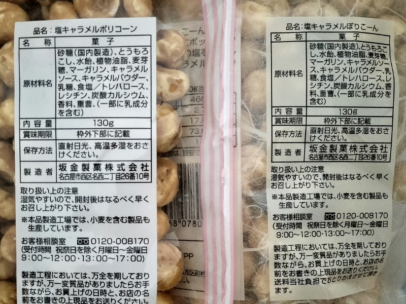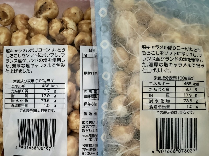 そして2つは同じ味(多分)で、同じ内容量でもブルーのパッケージの『塩キャラメルぽりこーん』の方が価格がお安いということがわかった。