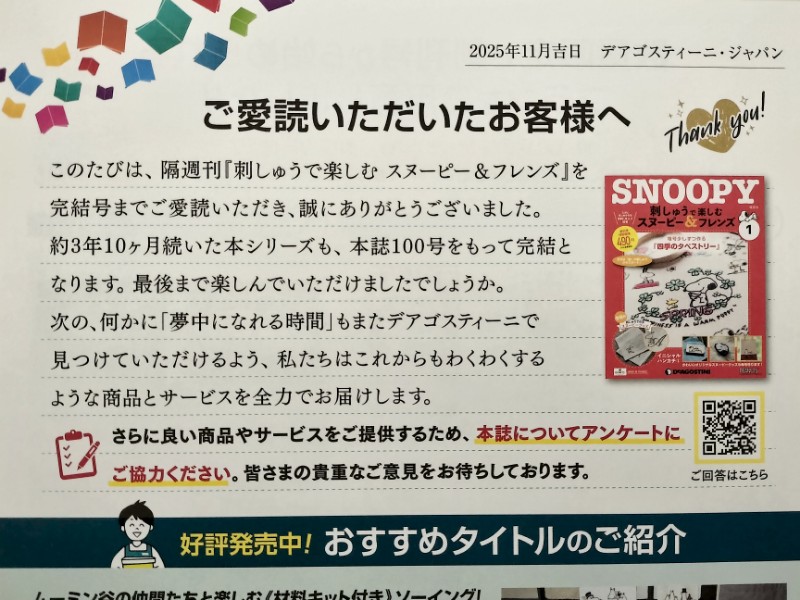 『刺繍で楽しむスヌーピー&フレンズ』第100号(完結号)はこんな感じ