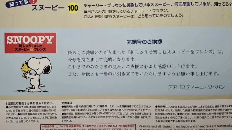 『刺しゅうで楽しむスヌーピー&フレンズ』第100号(完結号)の感想
