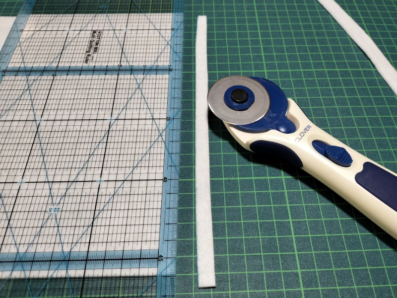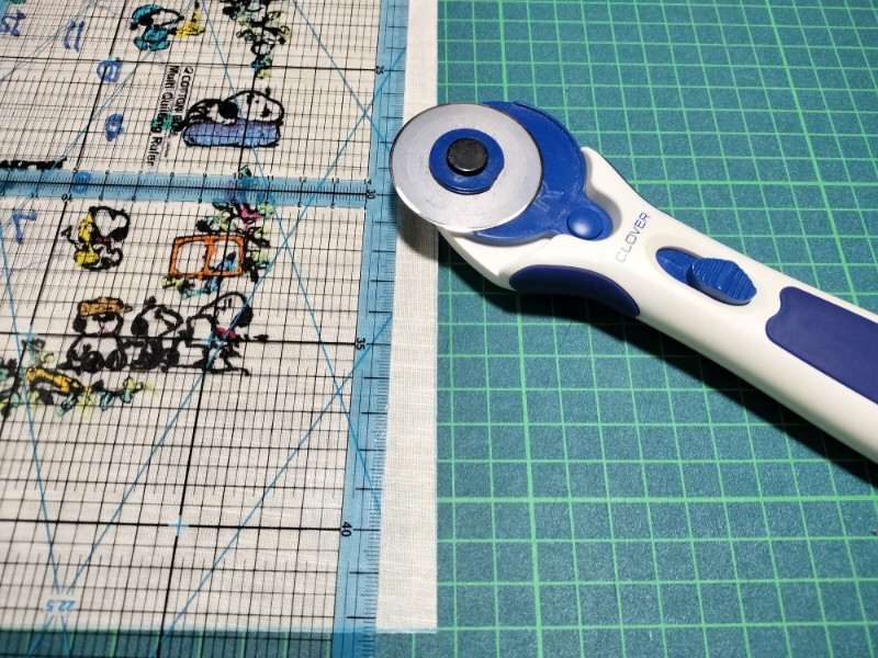 筆者が今回使用したのはクロバーさんの「ロータリーカッター45mm」と「カッティングマット特大60」、そして金亀さんの「COTTON BOLL マルチキルティングルーラー 15×60cm」。