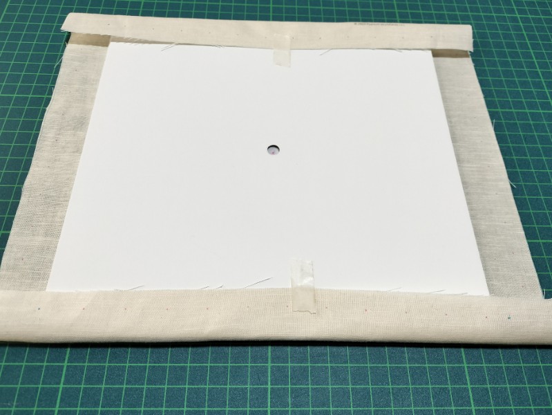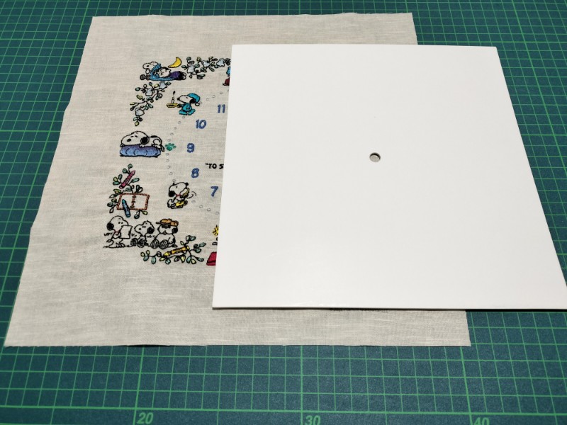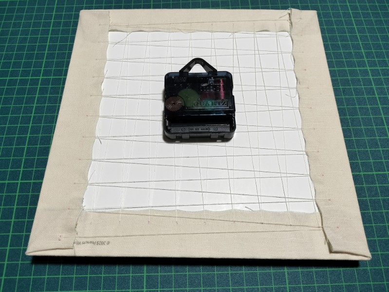 やっとのことで刺しゅうを終え台紙にピンと張った布に、ムーブメントをつけるための穴を開けるのは超緊張した。先の鋭いよく切れるハサミを使ったけれど、表布を恐る恐る切った後に、切りづらいキルト芯を切るためにハサミの先でガチャガチャするのは怖かった。
