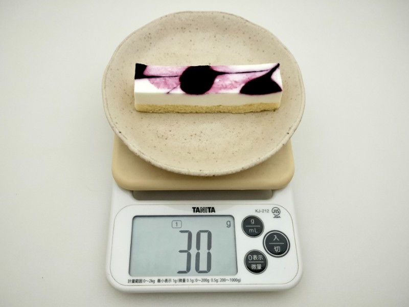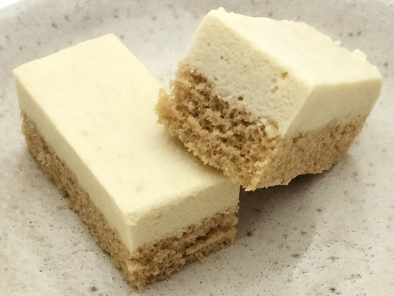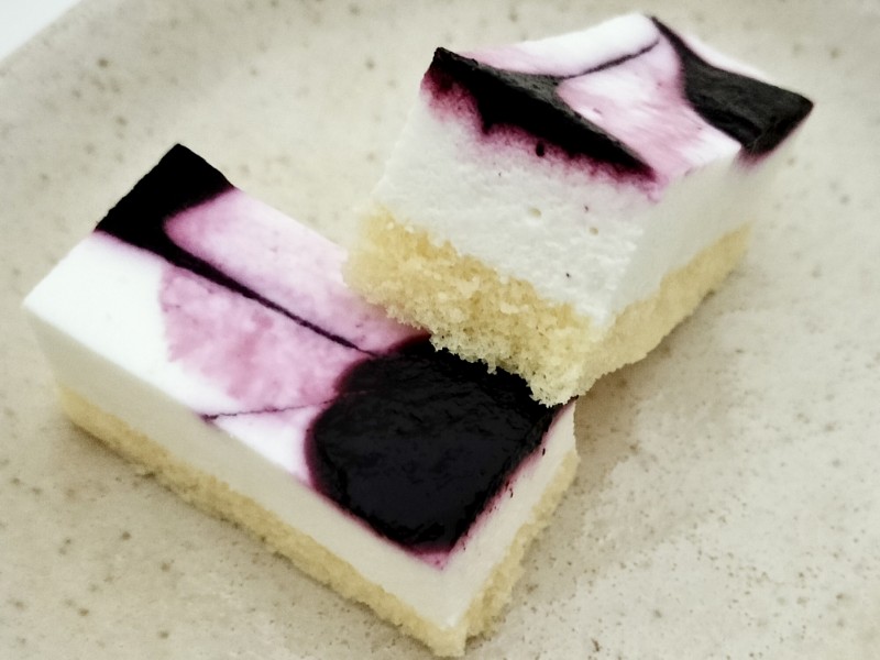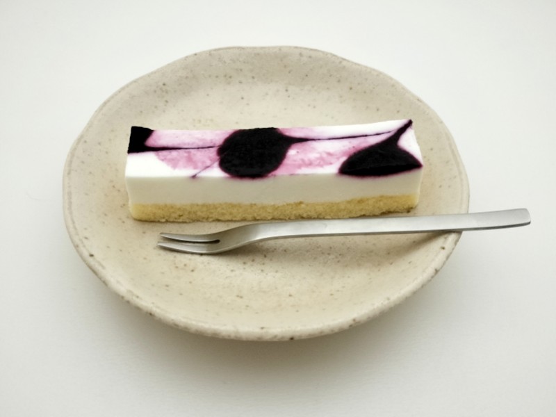 ブルーベリーの香り、風味があり、ヨーグルトの酸味も加わりスッキリとした甘さ。上の白い部分の質感はとても柔らかく、ケーキというよりムース。口の中であっという間に溶けてなくなる。