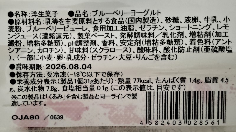 原材料名や栄養成分表示など。ブルーベリーヨーグルト1個あたりのカロリーは77kcal。