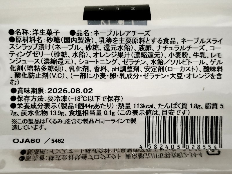 原材料名や栄養成分表示など。ネーブルレアチーズ1個あたりのカロリーは113kcal。