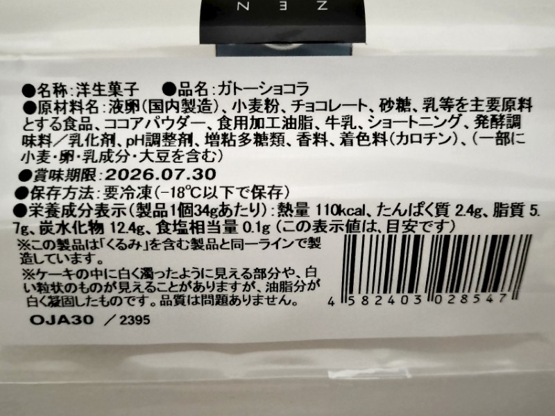 原材料名や栄養成分表示など。ガトーショコラ1個あたりのカロリーは110kcal。