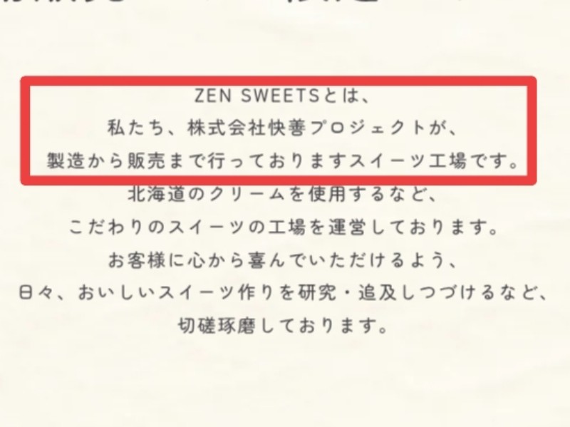 ZEN SWEETSのHPには、「ZEN SWEETSとは、私たち、株式会社快善プロジェクトが、製造から販売まで行っておりますスイーツ工場です。」とある。