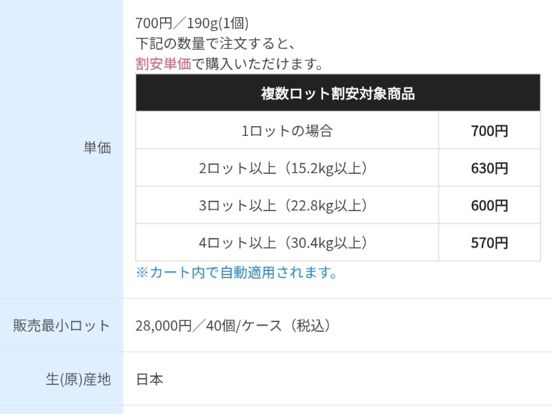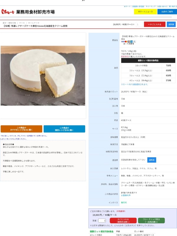 このサイトでは「特濃レアチーズケーキ」は、最小販売1ロット(40個)で、1個700円。4ロット(160個)以上で1個570円で販売されている。